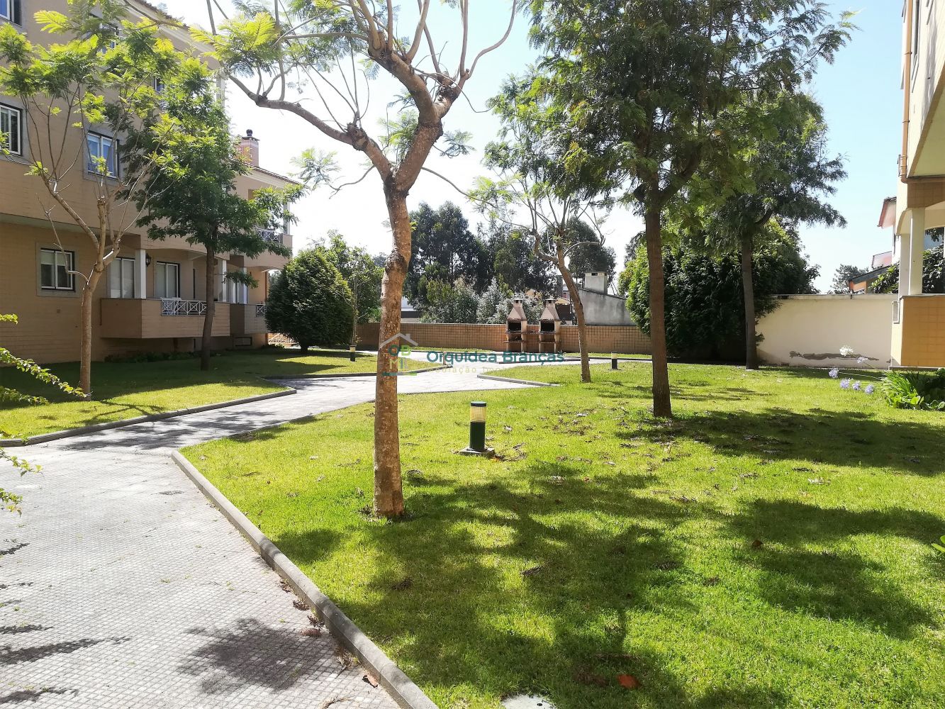 Em condomínio fechado com jardins e churrasqueira.